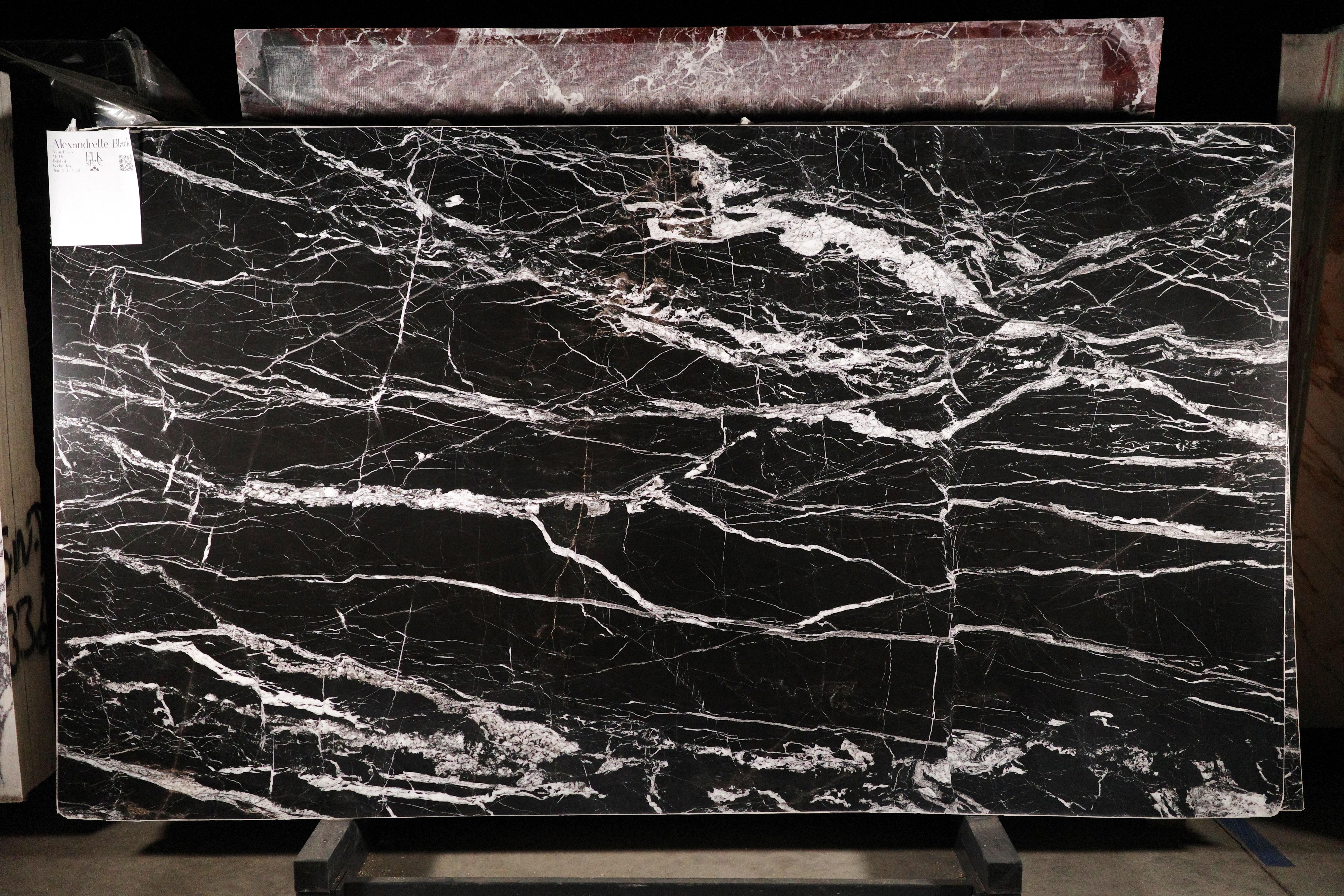 Nero Marquina marble slab features a deep jet-black base cut through by sharp, linear white veins that streak across the surface like bolts of lightning. This bold contrast creates a high-impact, graphic aesthetic—perfect for modern interiors, statement walls, kitchen islands, and dramatic commercial spaces.