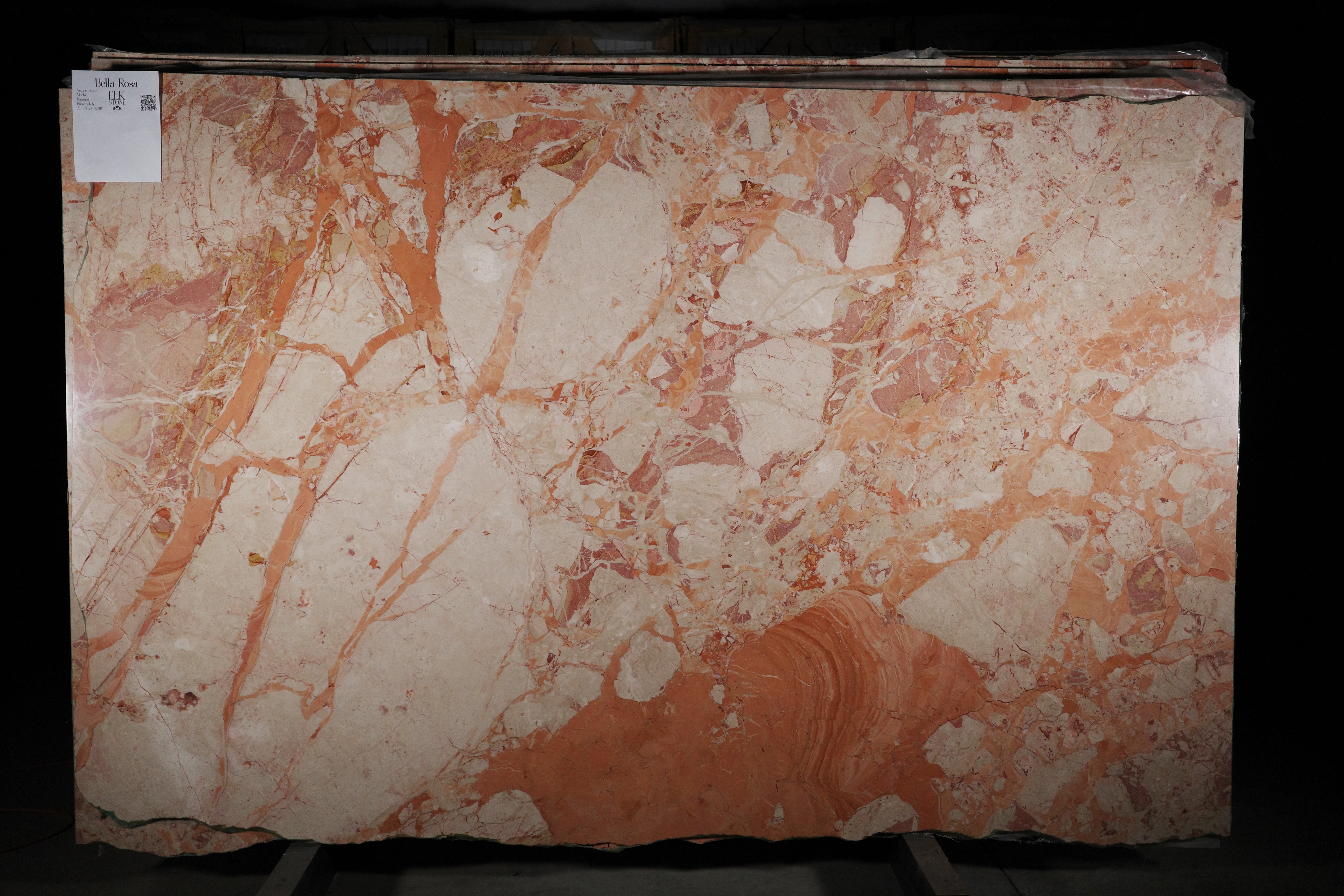 Bella Rosa marble slab blends soft peach and rose tones with cream-colored fragments in a naturally expressive, almost mosaic-like pattern. This lively combination evokes a warm, Mediterranean charm—perfect for inviting kitchens, cozy bathrooms, boutique interiors, and artistic feature walls.