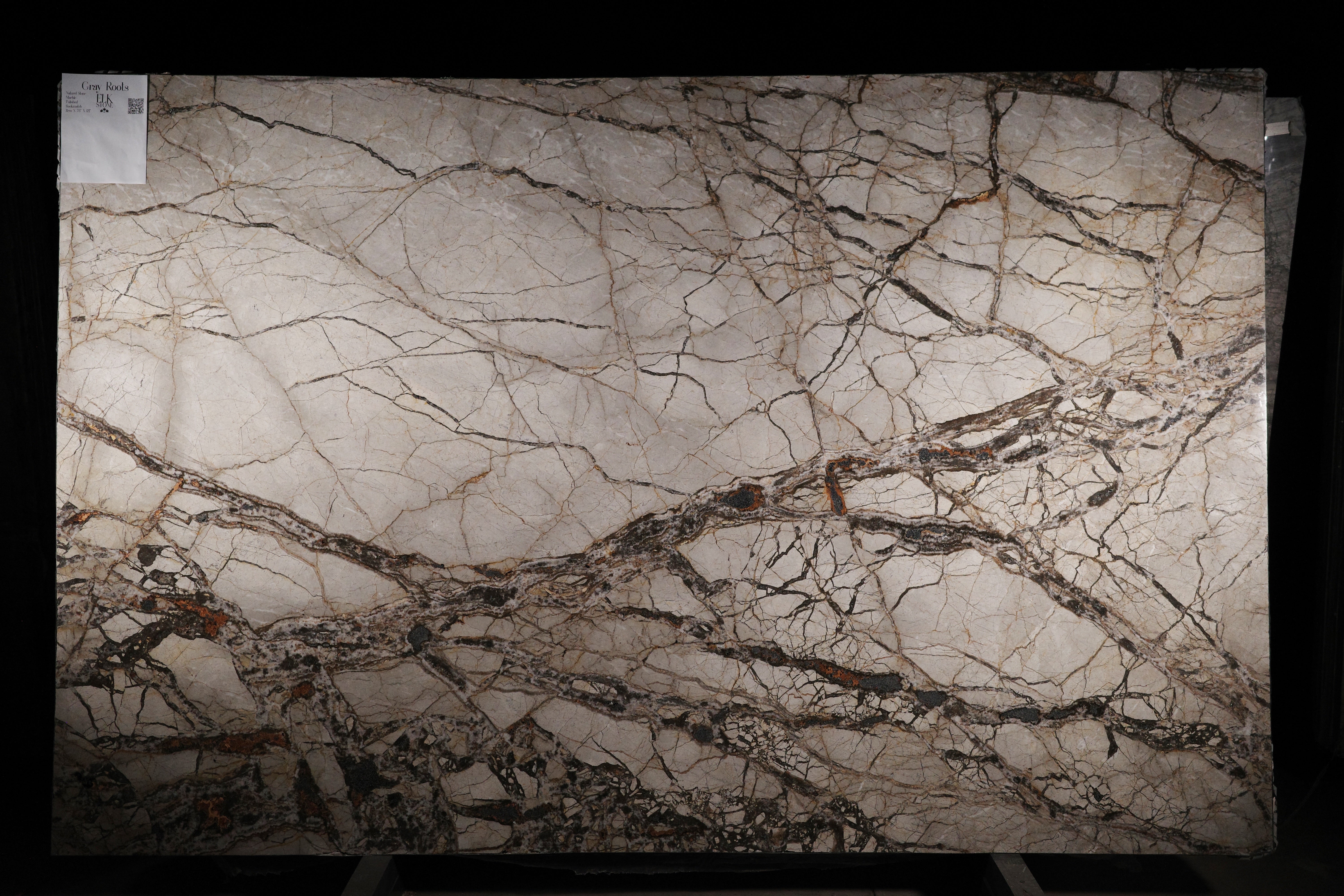 Grey Roots marble slab features a warm beige base disrupted by a dense network of dark veins and organic mineral clusters. This striking contrast creates a naturally fractured aesthetic that delivers depth, energy, and bold texture—ideal for designers seeking raw elegance and dramatic surfaces.