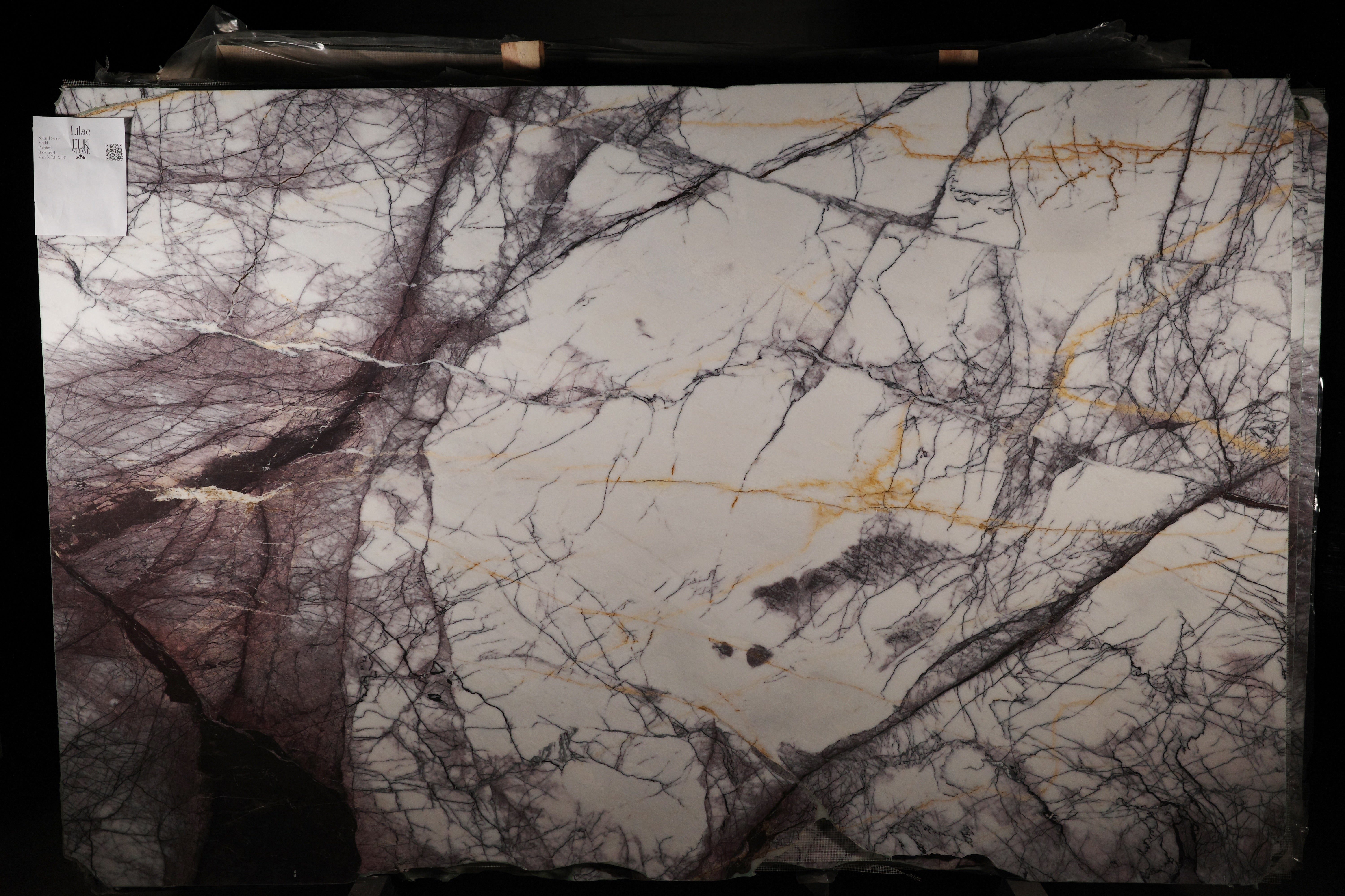 Lilac marble slab presents a radiant white background energized by bold veins of deep purple and subtle hints of gold. This striking contrast creates a vivid, high-impact visual—perfect for statement countertops, feature walls, and artistic interior accents.