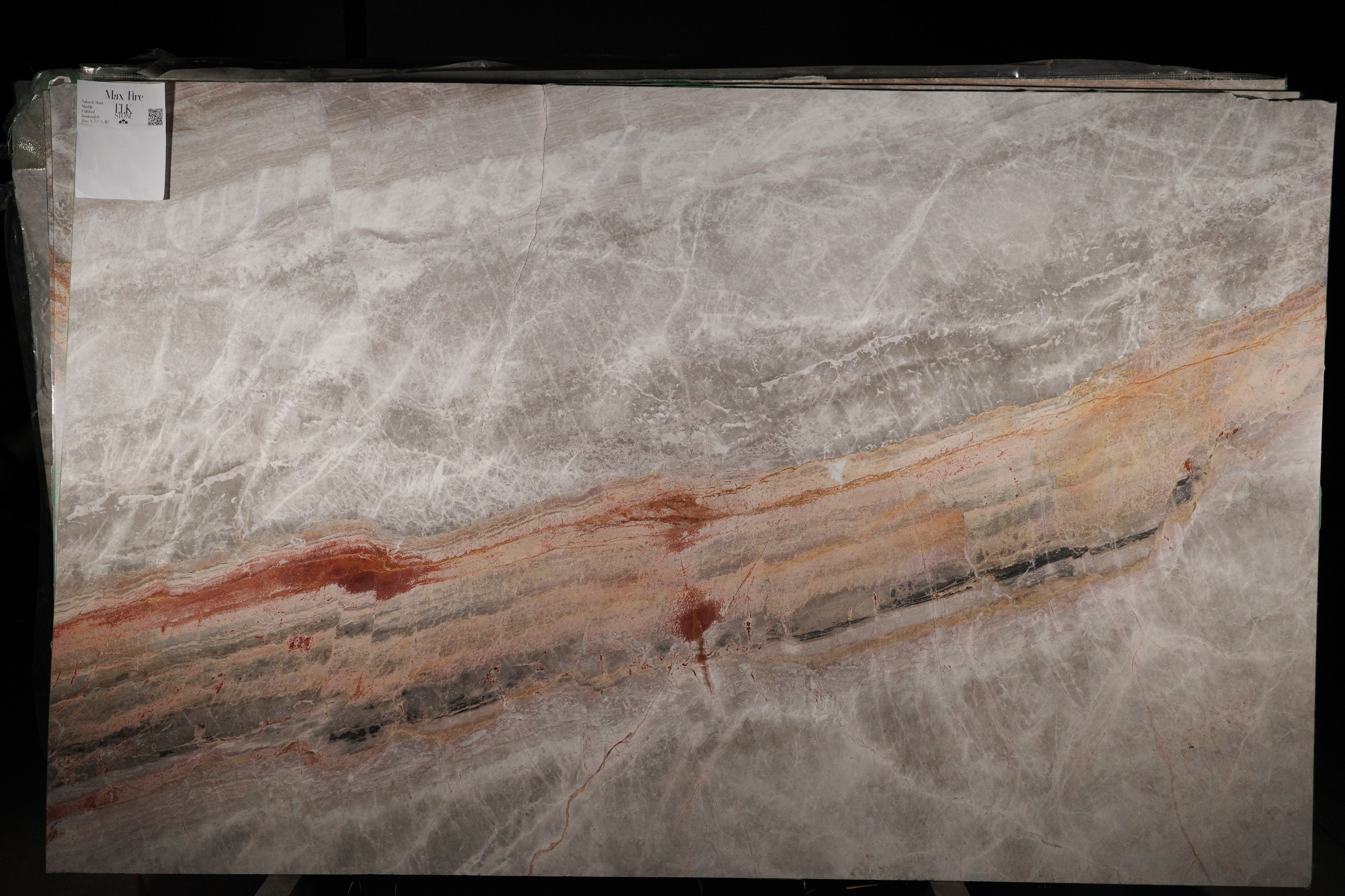 Max Fire marble slab combines soft silver undertones with a striking horizontal band of rust, peach, and charcoal, creating the look of a layered natural landscape. Its organic flow and earthy contrast offer quiet drama and refined depth—ideal for architectural interiors, feature walls, fireplaces, and bold kitchen applications.