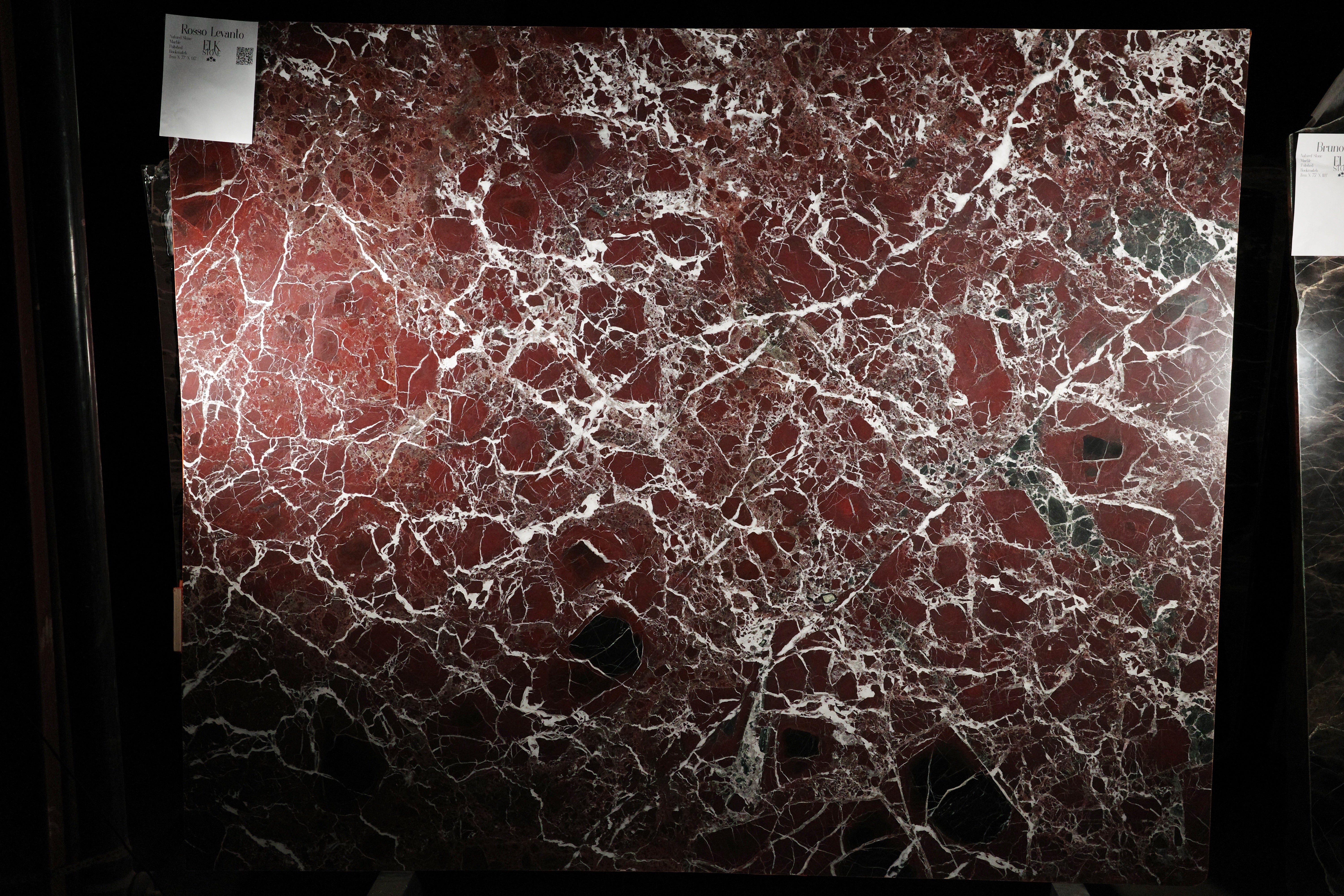 Rosso Levanto marble slab showcases rich burgundy tones interwoven with sharp white veining and deep black accents, creating a bold, regal aesthetic. This powerful contrast adds visual intensity and refined elegance—perfect for feature walls, luxurious bathrooms, fireplace surrounds, and statement countertops.